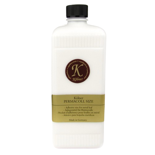 Permanent contact adhesive on acryl base. It is usable for interior applications only. It has more adhesive strength than Instacoll and is therefore particularly well suited for gilding with imitation metal leaf, like Dutch metal aluminium and copper (gold leaf can be applied as well. However, this gilding does not shine much). This high-quality adhesive ensures a special shine for all metal leaves. A poliment gilding effect can also be easily imitated with the red Permacoll.