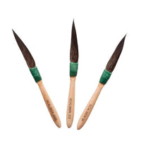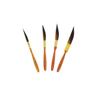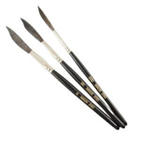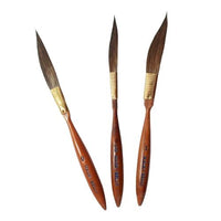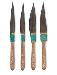 Mack pinstriping brushes are imported from Mack themselves in the US and are extremely popular within the pinstriping community. This brushes consist of mainly sword liners in slightly different shapes and widths and predominantly made from squirrel hair. Blue squirrel is the most readily available and comes in long lengths, as well as short lengths. It is generally used for striping brushes and lettering brushes. Brown, or kazan, is no longer as plentiful as it was several years ago. It is generally found in the shorter lengths and used for stripers, quills, and outliners. Both blue and kazan are very soft and fine. They point as well as kolinsky, but have very little snap, since the hair is not very resilient. Grey squirrel is the hardest to find and the most expensive. It is more durable, has more snap and makes a great quill or lettering brush.