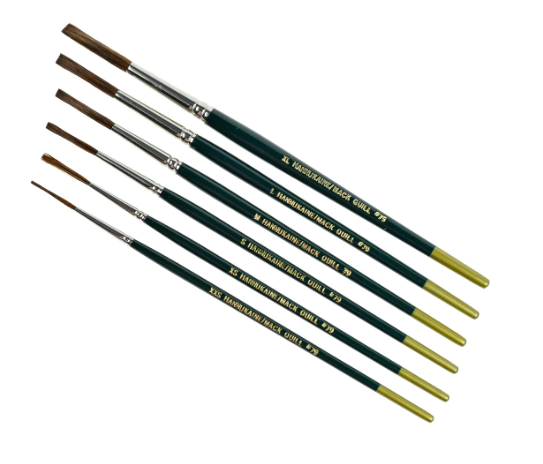These brushes feature a polished green handle with a gold tip, nickel ferrules, and synthetic hair.